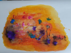 Já em séries como “A Cura pelo Amor” e “Cura pelos Poemas de Amor”, a artista une poesia e clínica, transformando rifocina, iodo, violeta genciana e azul de metileno — substâncias de cuidado — em gesto pictórico e poético. A arte, para Katia, é remédio e rito: uma prática que reconcilia corpo e alma, palavra e cor, ferida e criação.