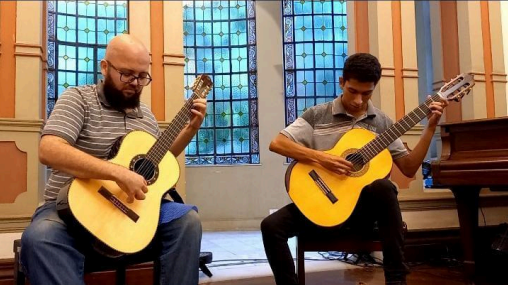 No dia 15 de novembro, às 17 horas, o Duo Guarujá — formado pelos violonistas Filipe Marinho e Flávio Schaffka — apresenta um concerto dedicado à música popular brasileira, com arranjos instrumentais para dois violões. O repertório inclui clássicos da MPB, samba, choro e composições autorais. “Nosso propósito é traduzir o diálogo entre dois violões como uma conversa viva, que une técnica, emoção e brasilidade”, afirma Flávio Schaffka.