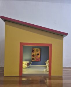 Ao longo de pinturas, desenhos, monotipias, tapeçarias, cerâmicas e azulejos, a artista constrói uma cartografia sensível onde mitos, casas e personagens emergem como portais de autoconhecimento e reconexão. Inspirada por autores como Bruno Bettelheim e Angela Carter, Katia reinterpreta o bosque dos contos de fadas como espaço de transformação interior, em que o feminino se confronta com suas próprias sombras para renascer em novas formas simbólicas.