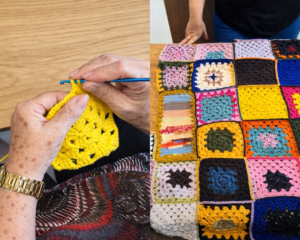 Quadradinhos de crochê viram cobertores para idosos no Shopping Pátio Aviação